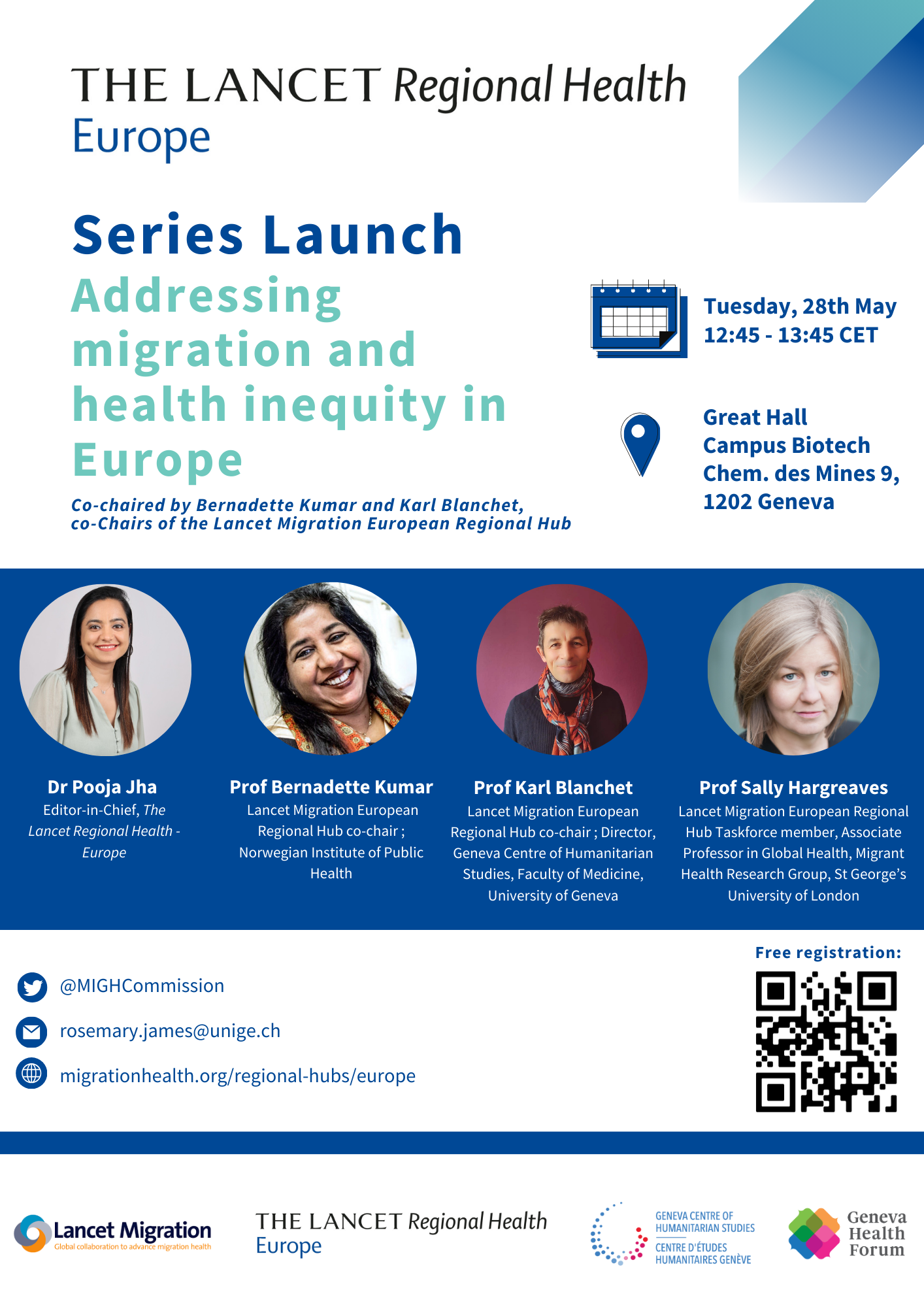 The Lancet Migration European Regional Hub is pleased to host a one-hour lunchtime session on the launch day of The Lancet Regional Health-Europe Series on Addressing migration and health inequity in Europe. This Series is co-chaired by Professor Bernadette Kumar and Professor Karl Blanchet, co-Chairs of the Lancet Migration European Regional Hub. Dr Pooja Jha, Editor-in-Chief of The Lancet Regional Health- Europe will introduce the Series. Professor Kumar and Professor Blanchet, and Professor Hargreaves will then present various papers within the Series. The themes span widely – from vaccine equity to racism and discrimination, and universal health coverage. There will be an opportunity at the end of the presentations to engage in a lively discussion about the current state of health equity research, policy and practice among refugee and migrant groups in Europe and sharing of good practices for an equitable way forward.